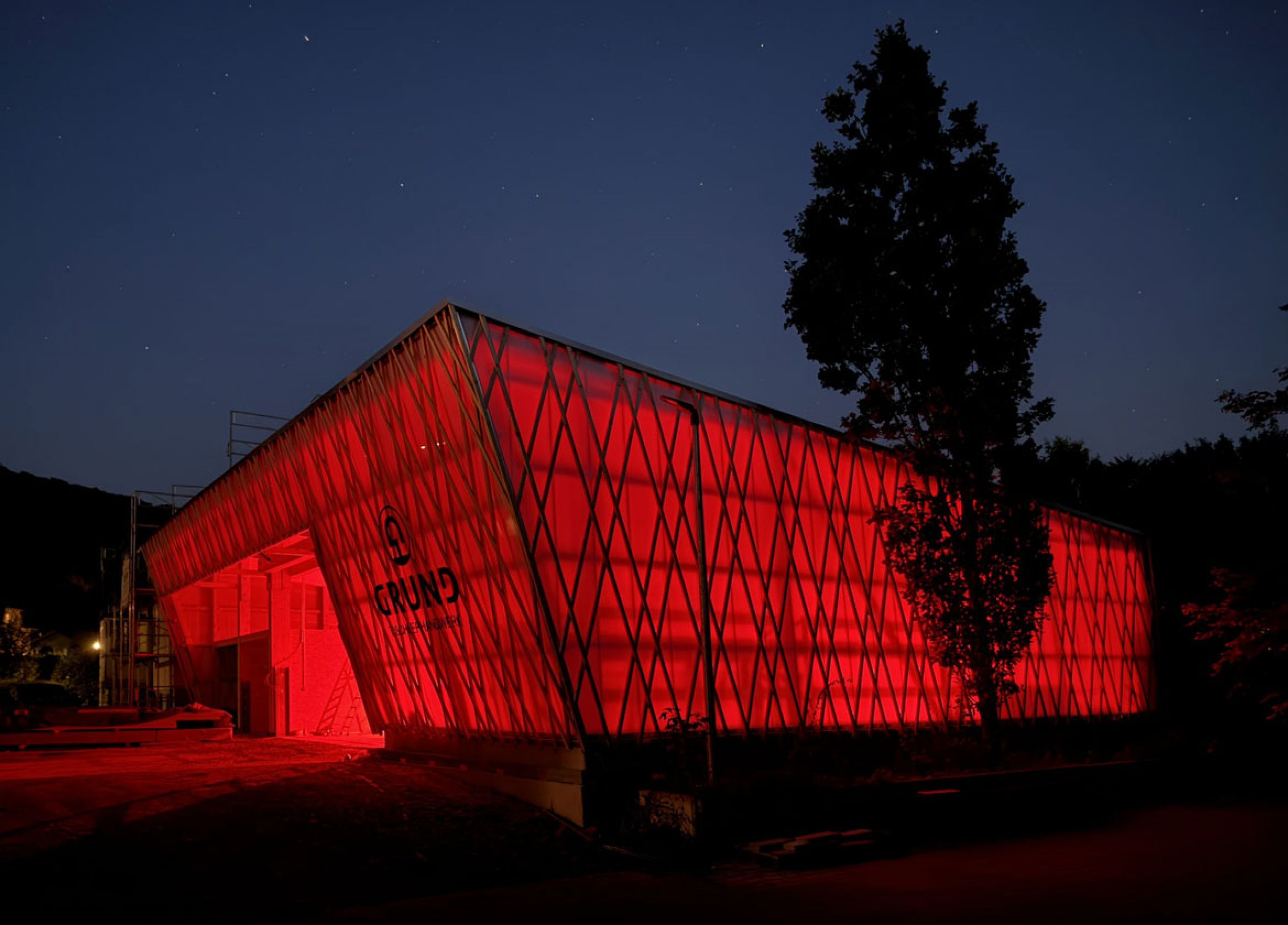 Bei Nacht entfaltet das Gebäude seine besondere Wirkung: Die Fassade beginnt sanft zu leuchten und verleiht der Halle eine atmosphärische Präsenz.