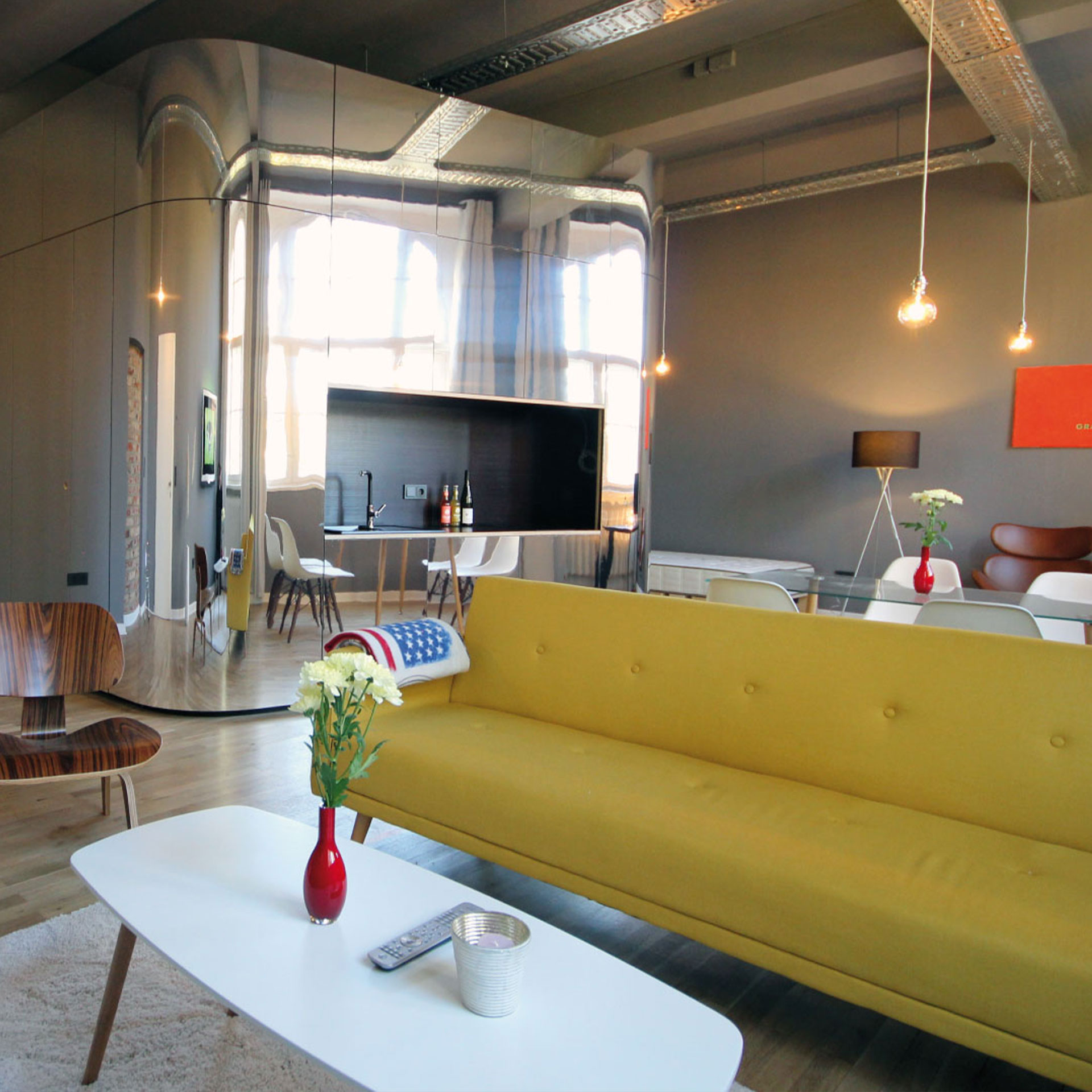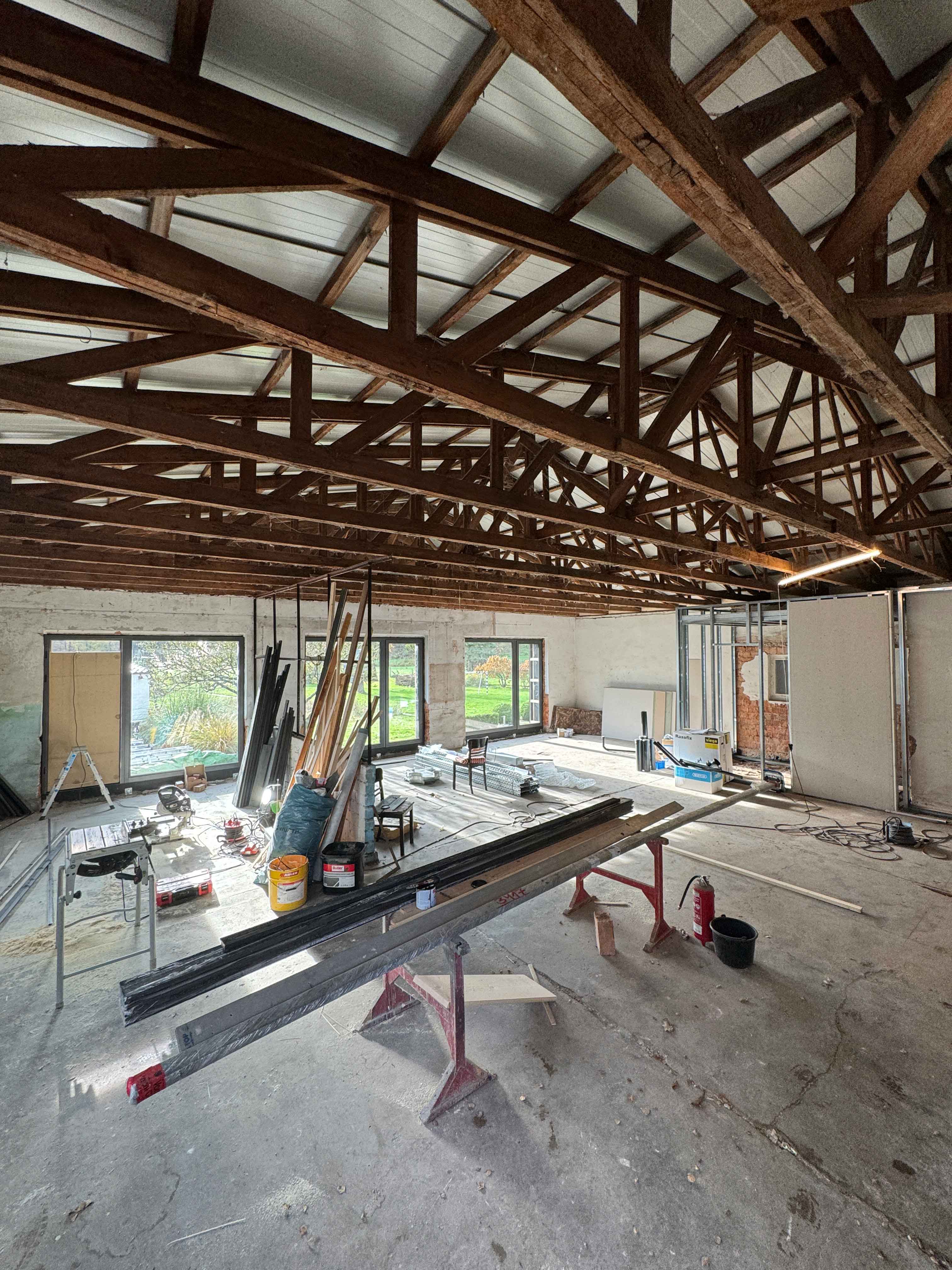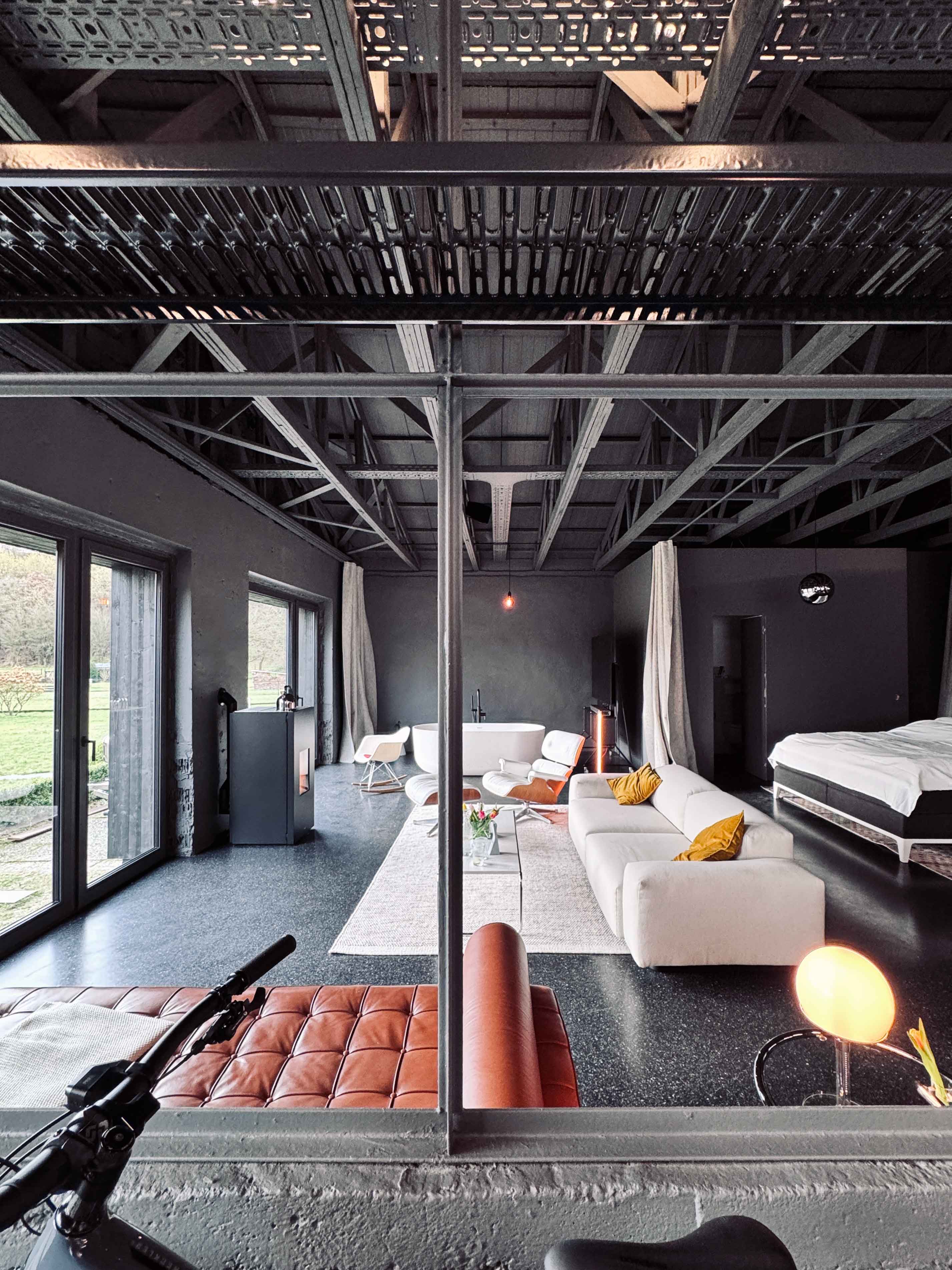 Bei der Renovierung wurde auch die Dachbinderkonstruktion freigelegt, um den einzigartigen Charme des Raumes zu betonen. Dieser Schritt verlieh dem Loft ein rustikales Flair und schuf gleichzeitig ein offenes Raumgefühl.