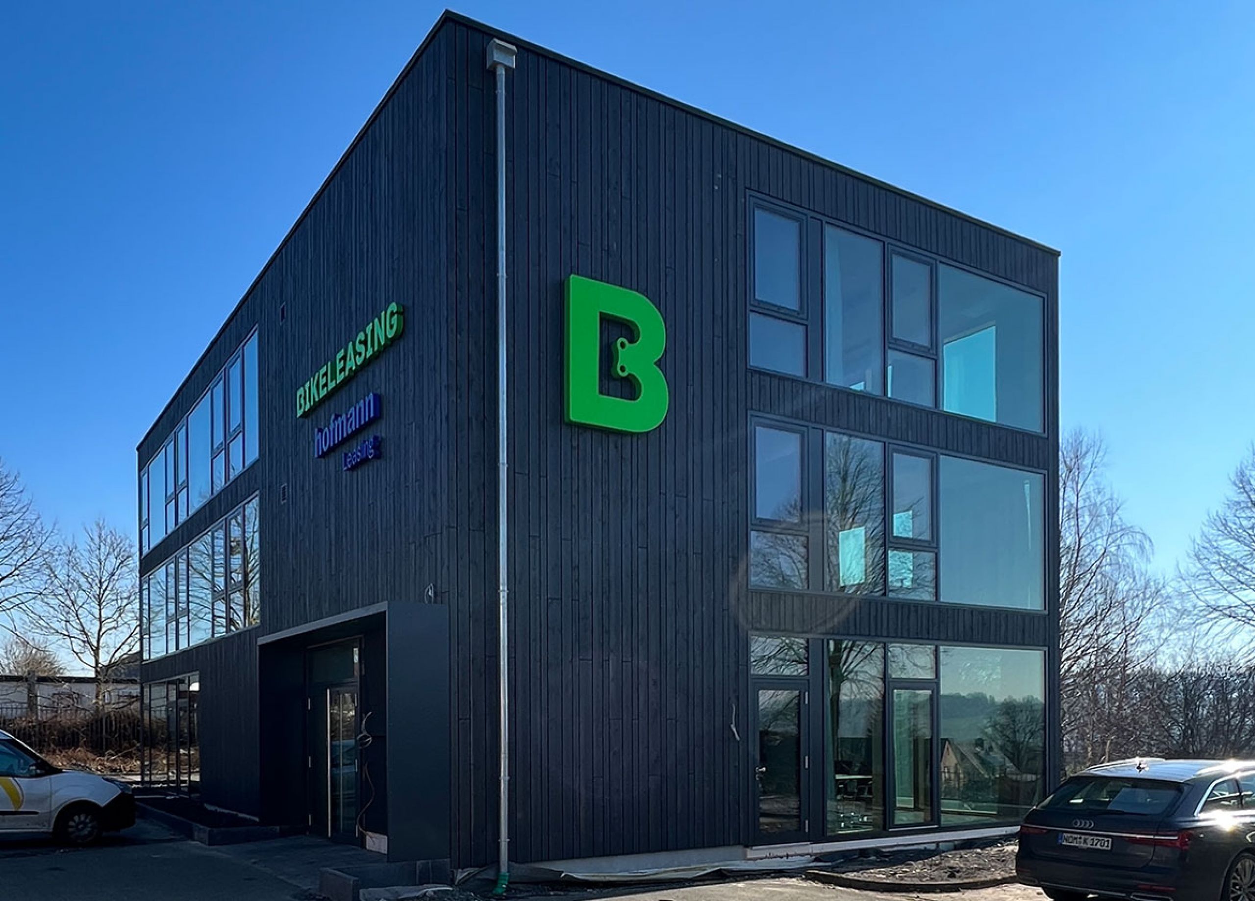 Nach nur acht Monaten Bauzeit ist das dreigeschossige E-Bürogebäude in Holzbauweise fertiggestellt. Die Außenanlagen werden jetzt noch vollendet.