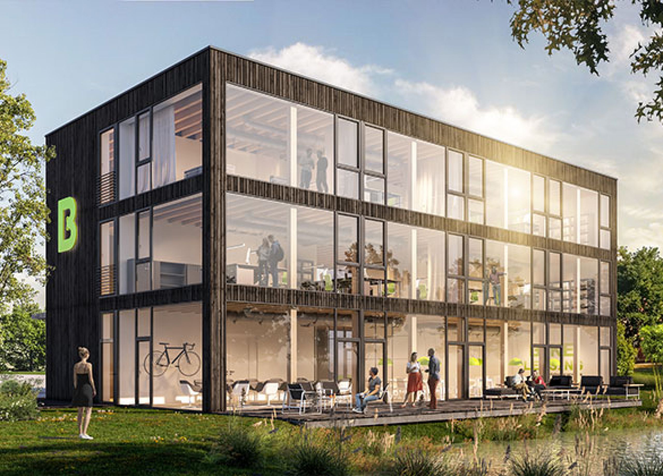 Baubeginn des E-Bürogebäude in Holzbauweise. Der Fokus bei dem dreigeschossigen Gewerbebau liegt auf Nachhaltigkeit. Eine vorgefertigte und wirtschaftliche Holzkonstruktion, die flexible Raumgestaltungen zulässt und Nachnutzungen ermöglicht. Das hochwärmegedämmte Low-Tech Bürogebäude wird elektrisch beheizt und kommt ohne aufwendige Gebäudetechnik aus.