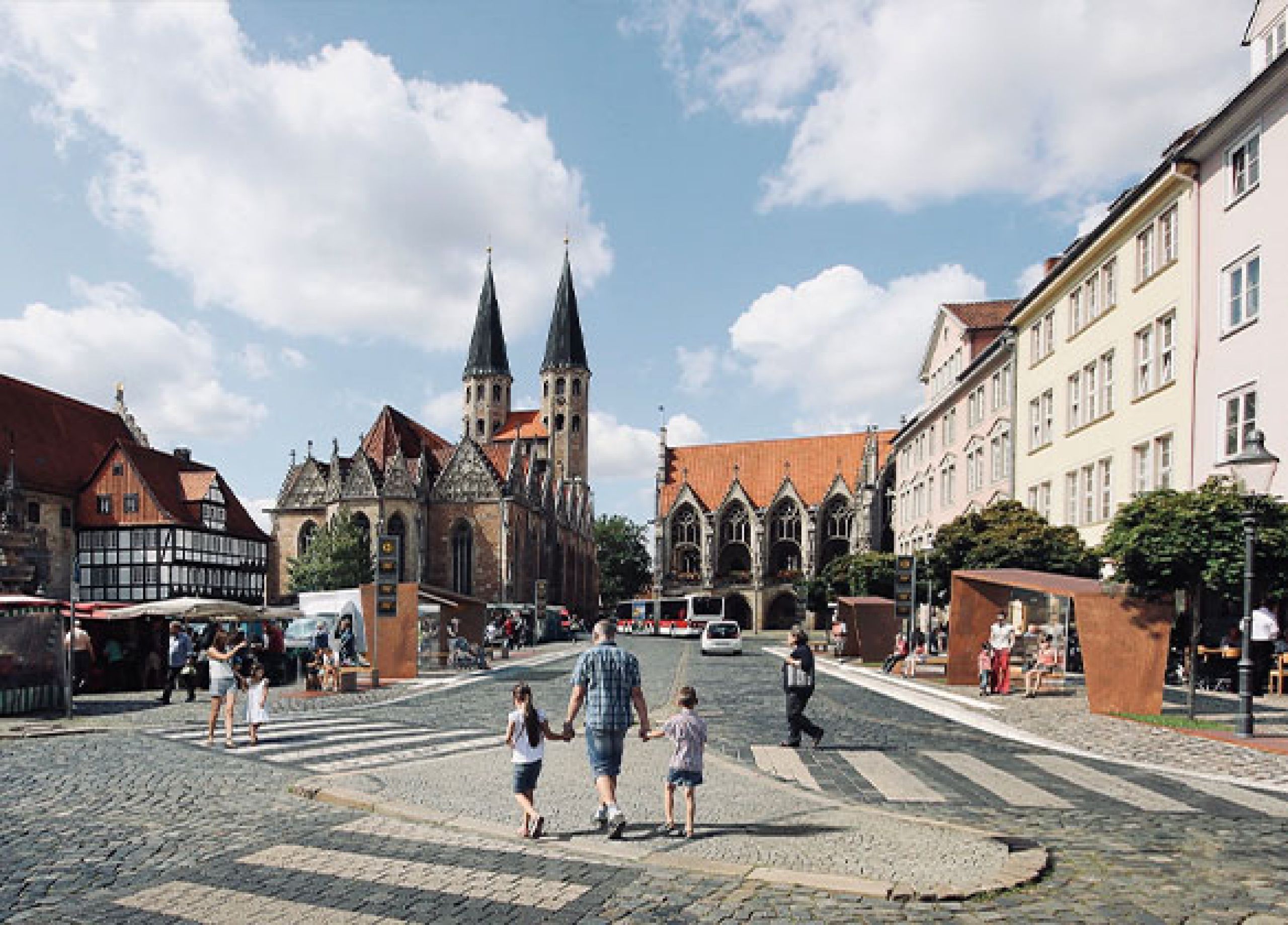 Der Altstadtmarkt in Braunschweig ist ein für sich selbst definierter, urbaner Innenstadtraum, umgeben von bedeutsamer historischer Bebauung. Der Entwurf der Haltestellenanlage folgt dem Anspruch, sich in diese Platzsituation einzufügen, ohne in Konkurrenz zur Altstadtbebauung zu stehen. Er fügt sich dezent in die vorhandene Qualität ein und behauptet sich durch Beständigkeit.