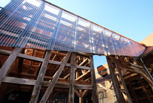September 2015 ... Rund 100 Tonnen Altlasten wurde von der Scheune entfernt, rückgebaut und entsorgt. Das "Haus-im-Haus"-Konzept wird durch den Einbau von Glasflächen an Giebel und als Dacheinschnitt ermöglicht. In dem freigeräumten Teilbereich der Fachwerkscheune sind zwei Raumzellen in Leichtbauweise entstanden, in denen 120 m² Bürofläche untergebracht sind. Die Fassade des Neubaus besteht aus spiegelnden Metallflächen.