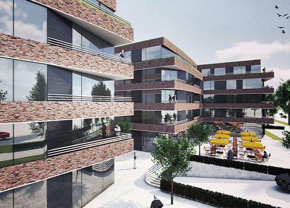Unter Berücksichtigung der baurechtlichen Vorgaben ergeben sich logische Gebäudeformen, die in ihrer Geschossigkeit eine Differenzierung der Gebäudeteile nach Außen vornehmen. Es entstehen vier- bis fünfgeschossige Baukörper und ein als wertvoll angesehen…