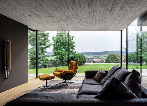 Das „Unsichtbare“ besitzt keine Außenwände. In der Glasfassade spiegelt sich die weite Landschaft, das Gebäude ist nahezu unsichtbar. Nachts hingegen verbindet sich der Außenbereich mit dem Wohnhaus und die Glasfassade wirkt nicht existent. Durch den offe…