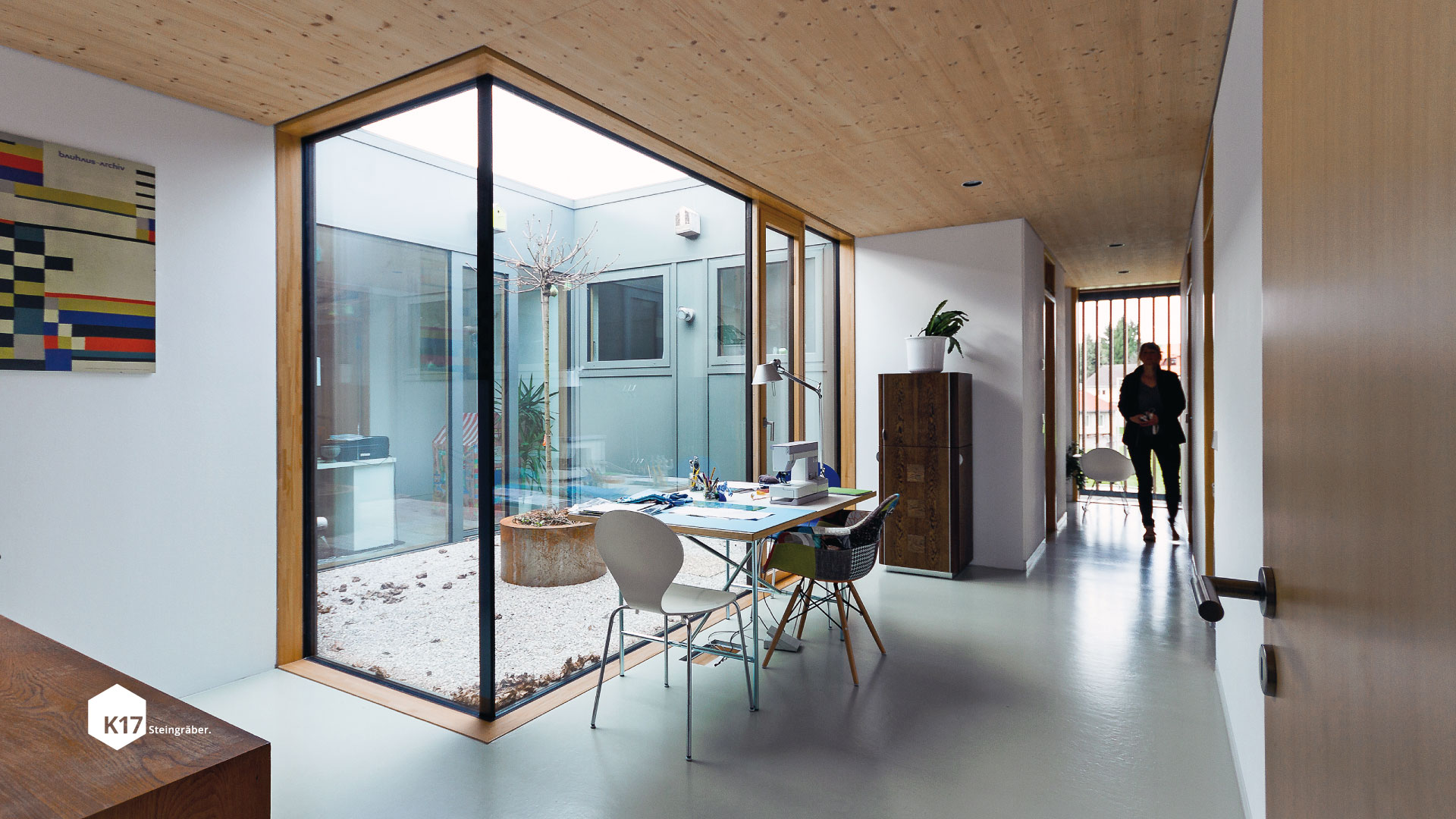Ein zentrales Atrium bringt Licht in die inneren Räume, während raumhohe Verglasungen im Obergeschoss für eine offene, lichtdurchflutete Atmosphäre sorgen. Die offene Lärchenholzfassade verbindet die Geschosse und integriert einen geschützten Laubengang im Obergeschoss des Passivhauses. Zudem fungiert sie als natürlicher Sonnenschutz.