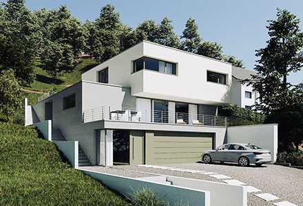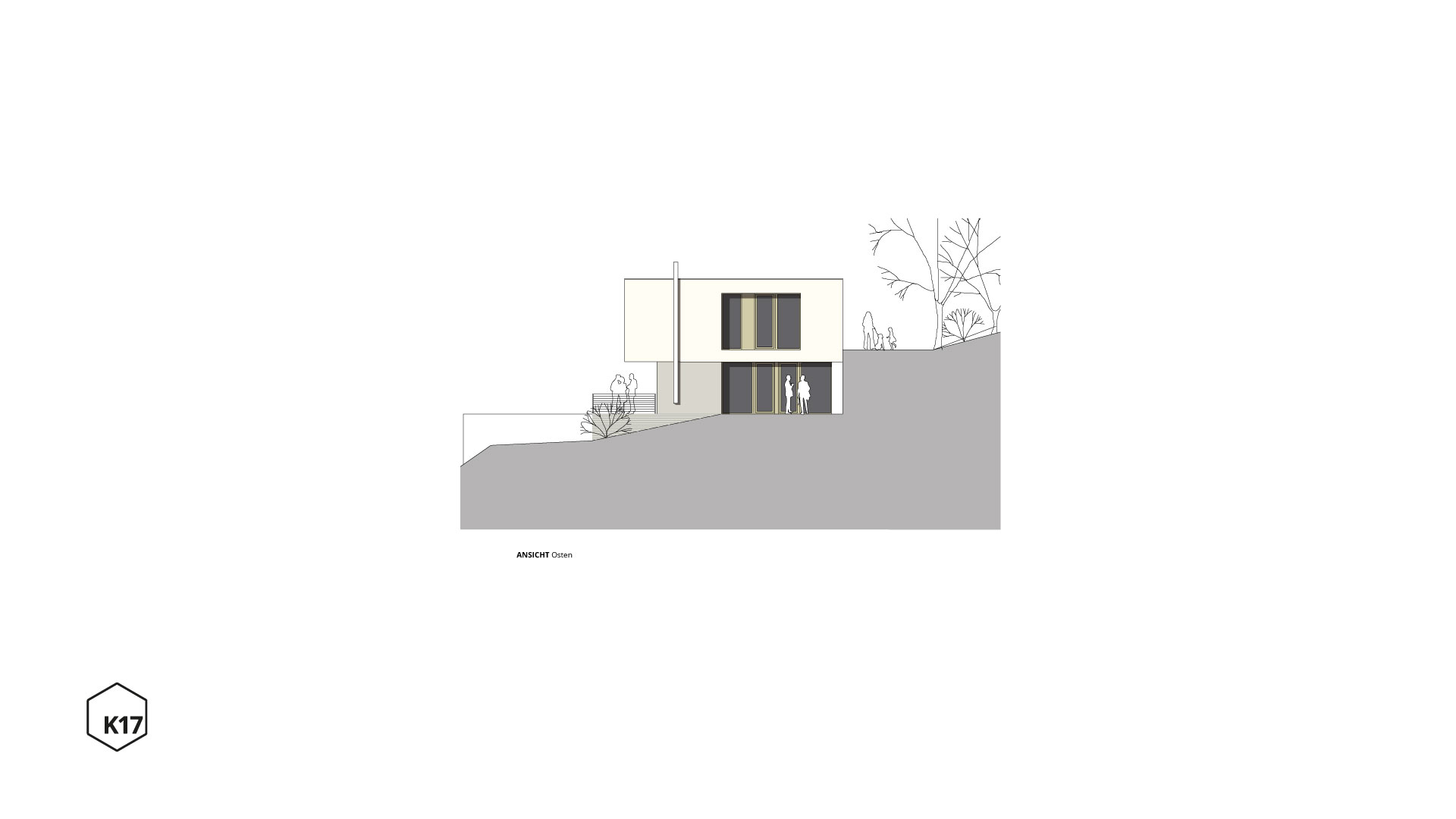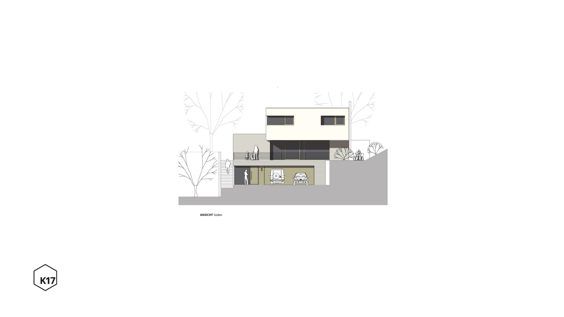 Im bayerischen Unterfranken soll das Wohnhaus mit Gewerbeeinheit an einem Steilhang entstehen. Die Ebenen reagieren auf das vorhandene Geländeniveau und lassen pro Geschoss den Zugang zum Außenbereich des nach Süden ausgerichteten Grundstücks zu. Es bilden sich somit geschütze und offene Terrassenbereiche. Der offene Grundriss orientiert sich über eine zentrale, einläufige Treppe. Ein kleiner Personenaufzug wurde bei der Planung bedacht.